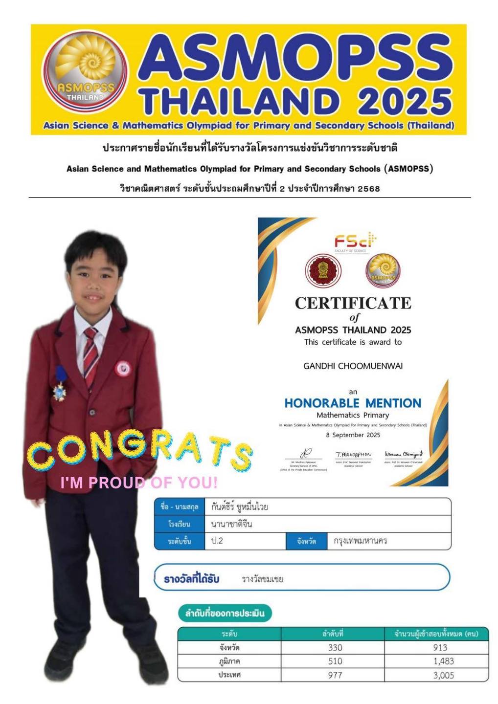 ขอแสดงความยินดีกับเด็กชายกันต์ธีร์ ชูหมื่นไวย นักเรียนชั้น G.2 โรงเรียนนานาชาติจีน ได้รับรางวัล ชมเชย โครงการแข่งขันวิชาการระดับชาติ Asian Science and Mathematics Olymplad for Primary and Secondary Schools (ASMOPSS) วิชาคณิตศาสตร์ ระดับชั้นประถมศึกษาปีที่ 2 ประจําปีการศึกษา 2568